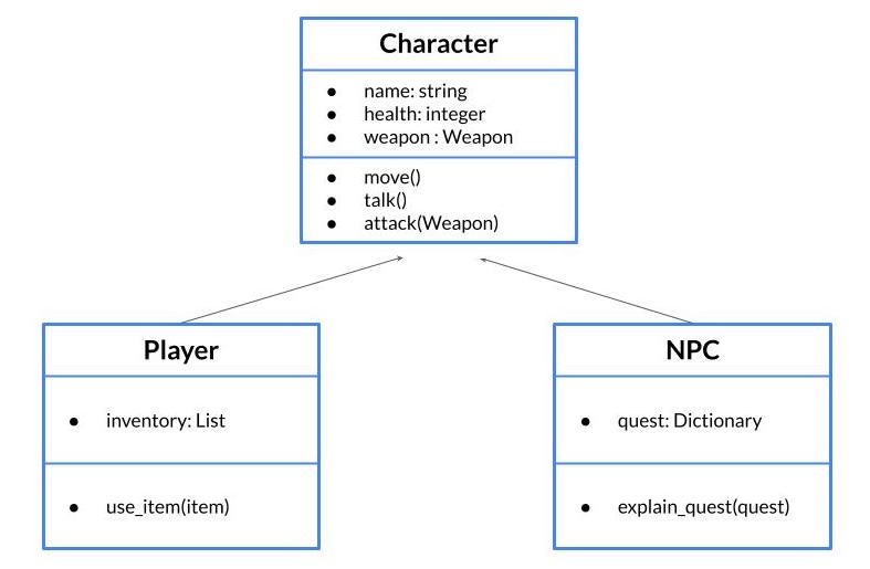Imagine our game has two types of characters: a player character and a non-playable character (NPC). Both types of characters should have the same properties and methods as the base Character class, but each will have additional unique attributes. For this, we can utilize inheritance.