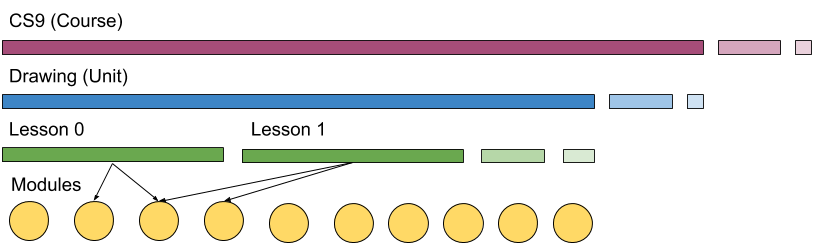 Making with Code is organized into courses, units, and lessons. Courses are the highest-level container for content. They contain one or more units. Units are clusters of content organized around essential questions, providing materials to orchestrate student learning for 1-2 months. Lessons are the finest level of organization, representing one class meeting. Lessons will be the hardest to adapt to different school schedules, so using lessons is optional. Courses and units are purely organizational structures, while lessons are also themselves a content type.