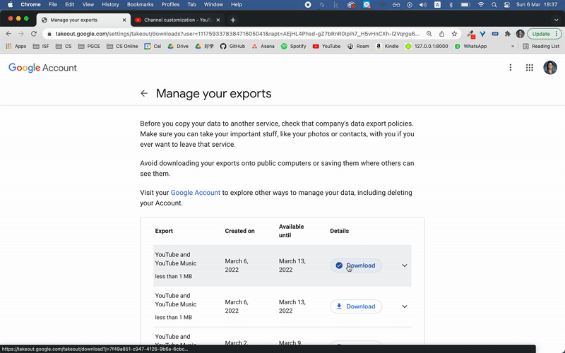 Create export.This may take awhile. It may only take a few minutes or an hour. You will receive an email when your data is ready for download.