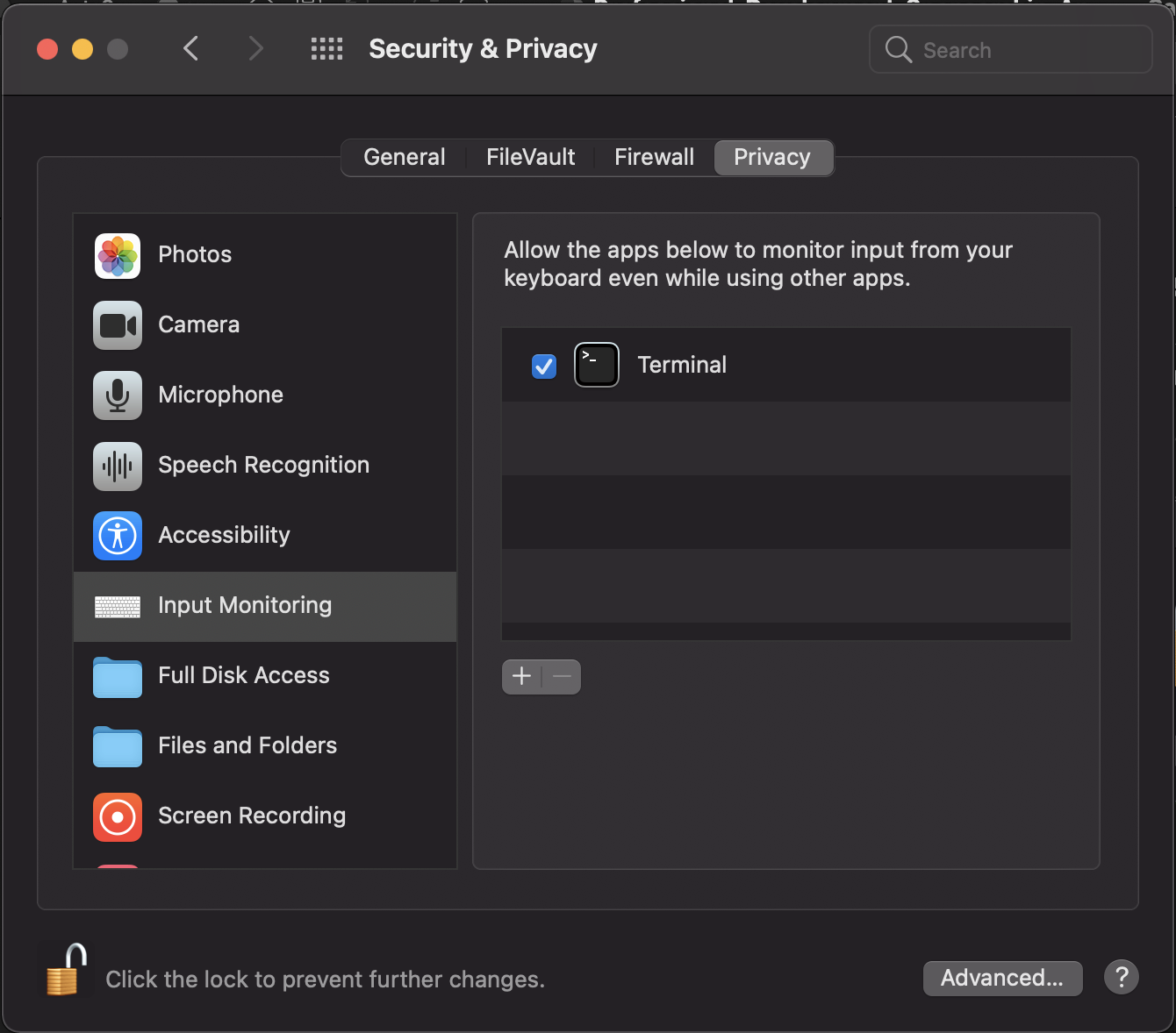 ๐ป Go to Settings > Security & Privacy > Privacy. Scroll to Input Monitoring and add Terminal. Terminal to need to restart in order to save this preference.